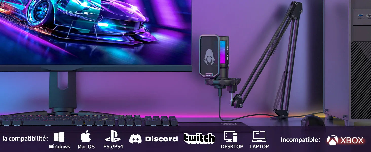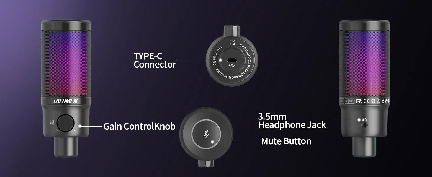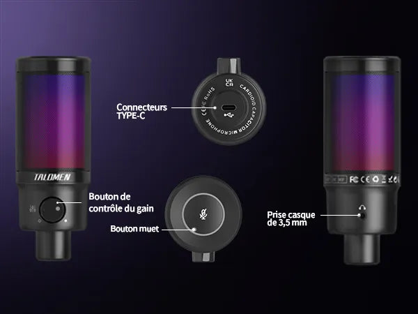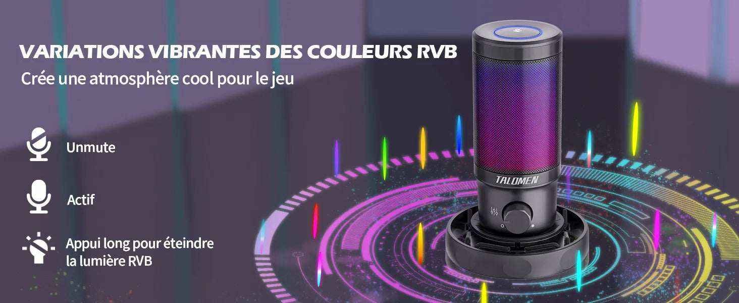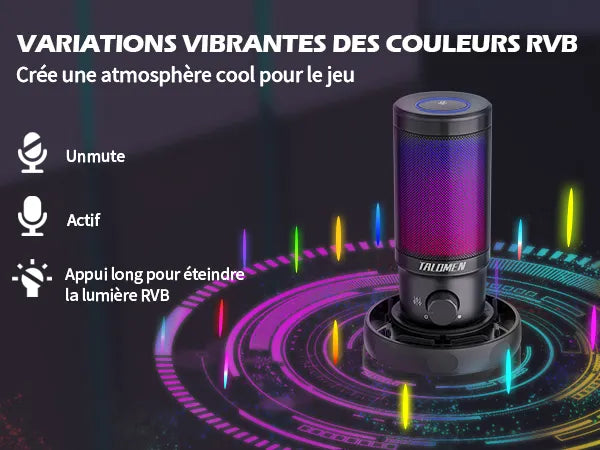 Le microphone de jeu USB Talomen est doté de lumières RVB lumineuses pour améliorer l'atmosphère de jeu pour vous ; il peut également capturer votre voix dans un environnement bruyant, communiquer plus efficacement et améliorer le plaisir du jeu.