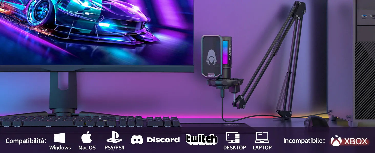 Non sono necessari plug-in aggiuntivi o complicati passaggi di configurazione del dispositivo, compatibile con Windows, Mac e PS4 PS5. L'estremità del microfono è un'interfaccia di tipo C, reversibile, nessun problema per collegarla nel modo giusto in un'atmosfera di gioco buia. Il cavo USB da 2,5 m è abbastanza lungo da estendersi dal retro dell'host al desktop per la registrazione audio.