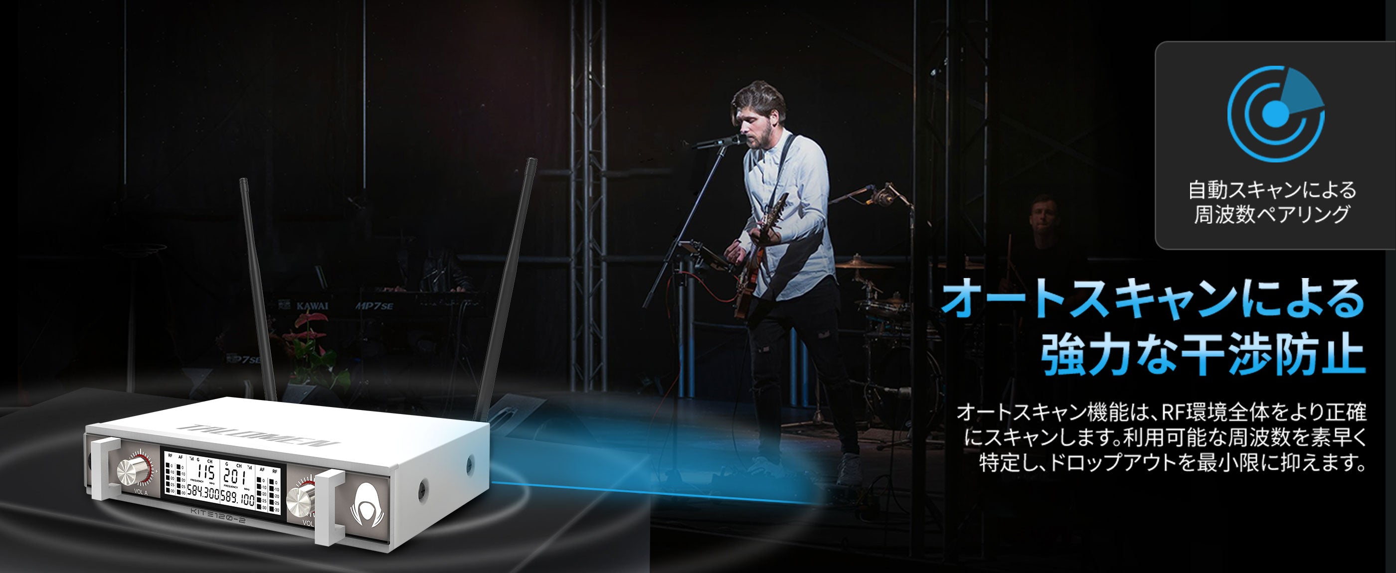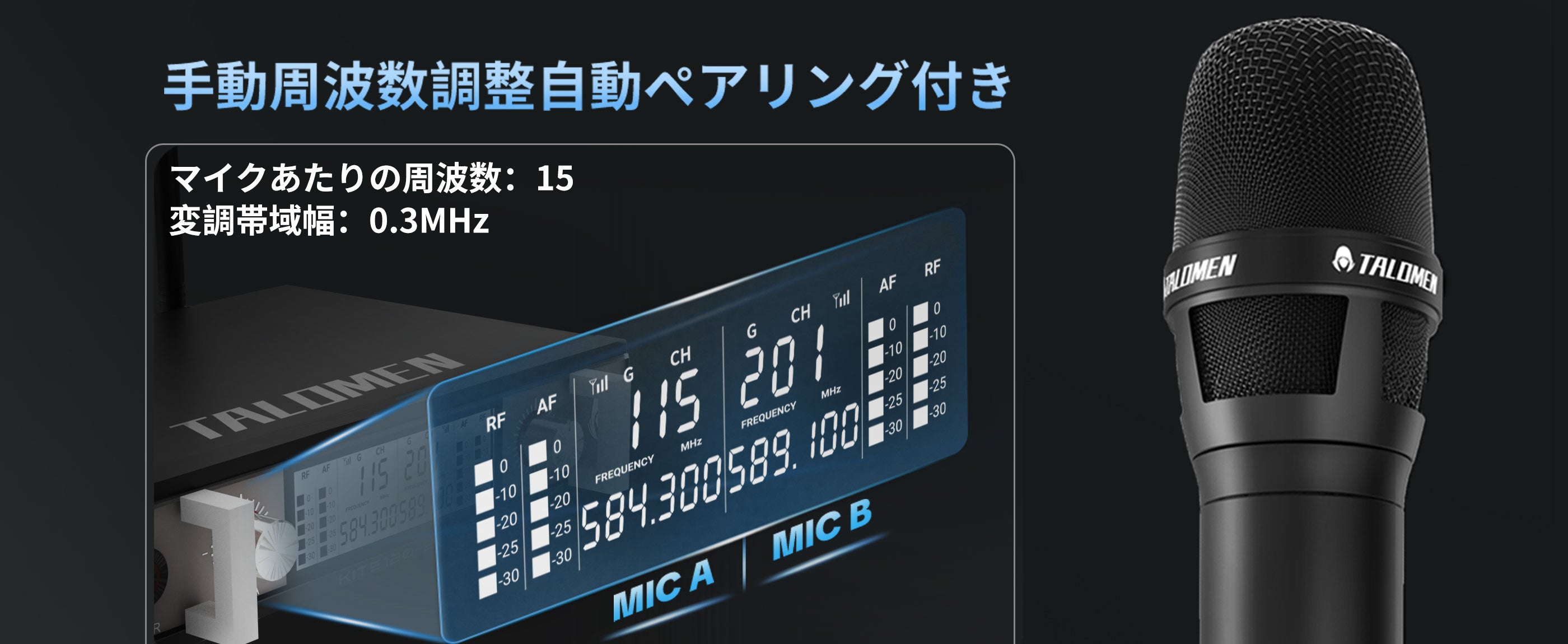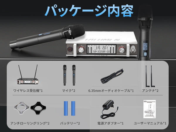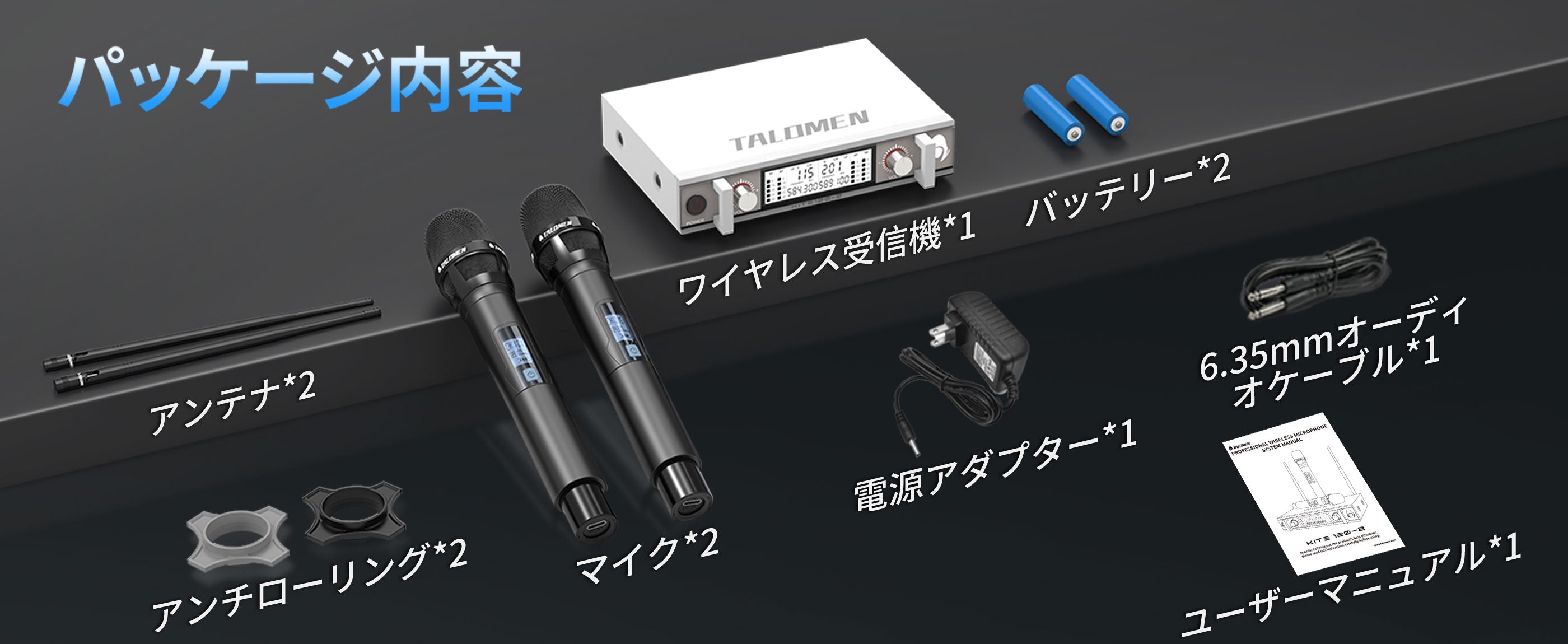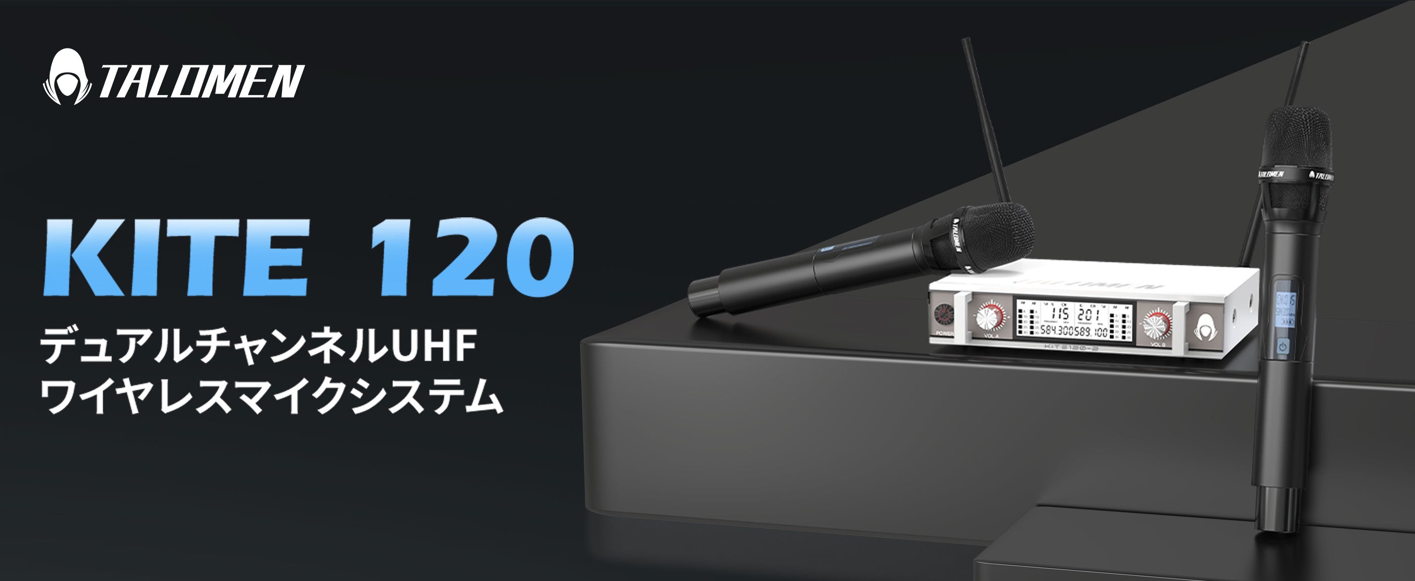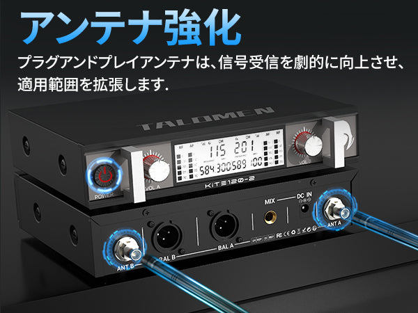 Talomen K120は、デュアルチャンネルUHFワイヤレスマイクシステムです。カスタムアンテナ付きの受信機と、プロ仕様にチューニングされたダイナミックマイク2本が付属しています。教会の礼拝、カラオケ、ホームパーティーなどに最適です。