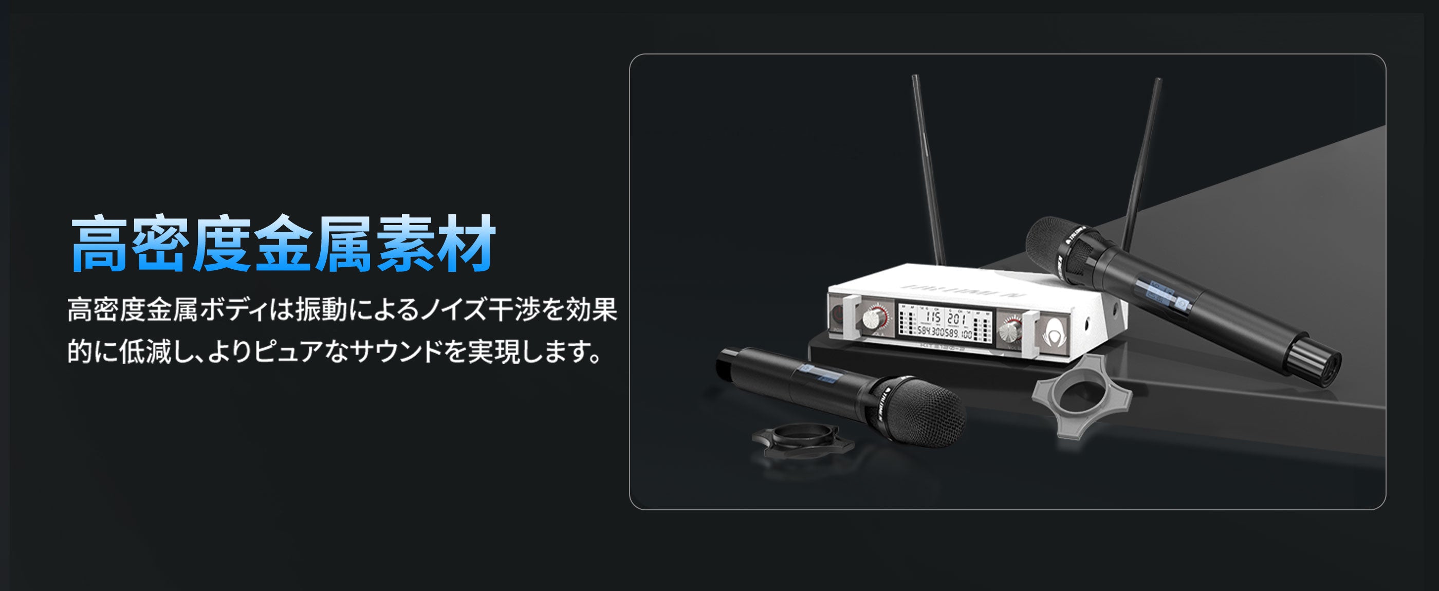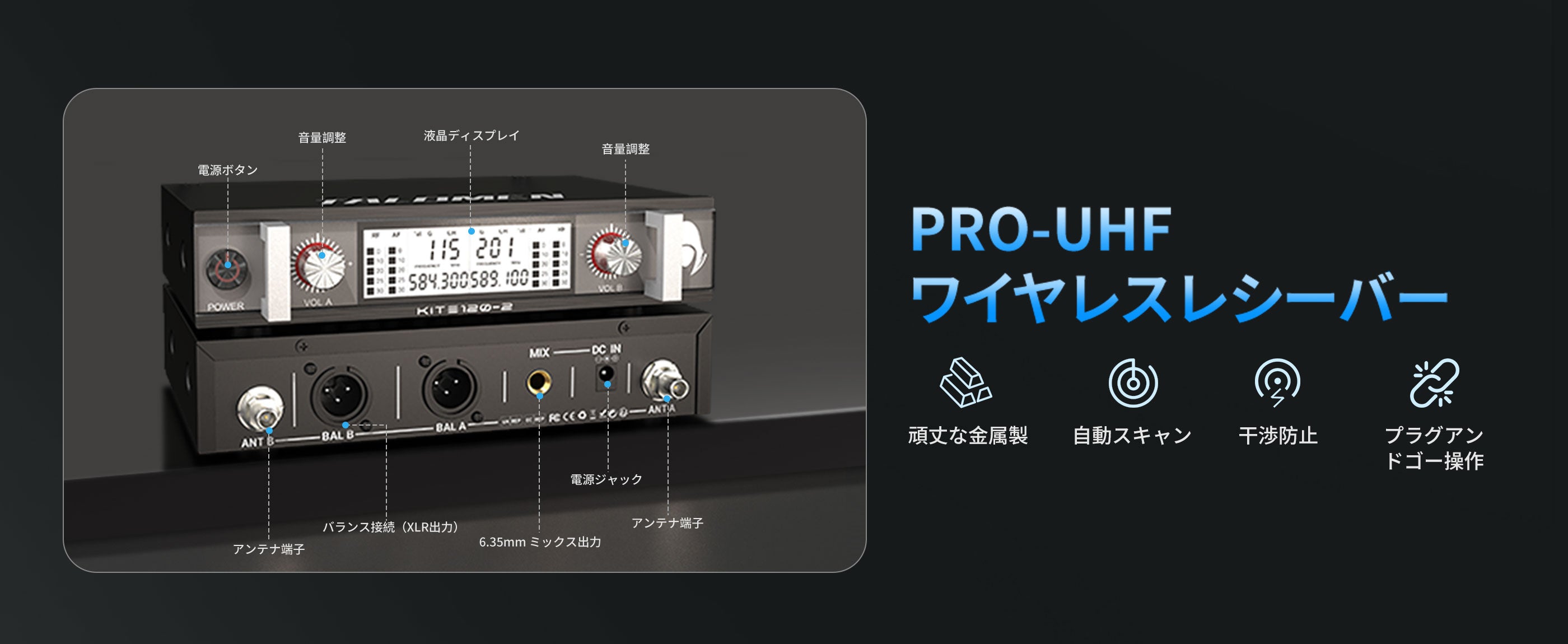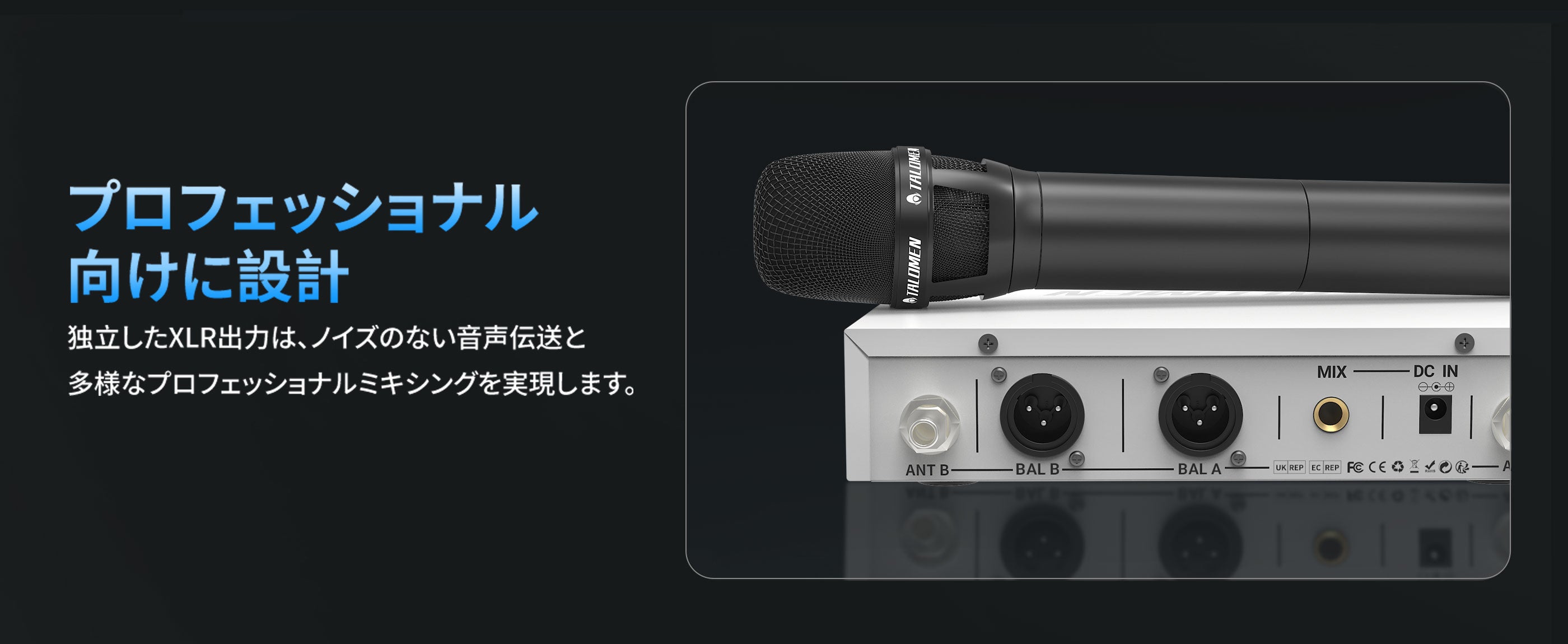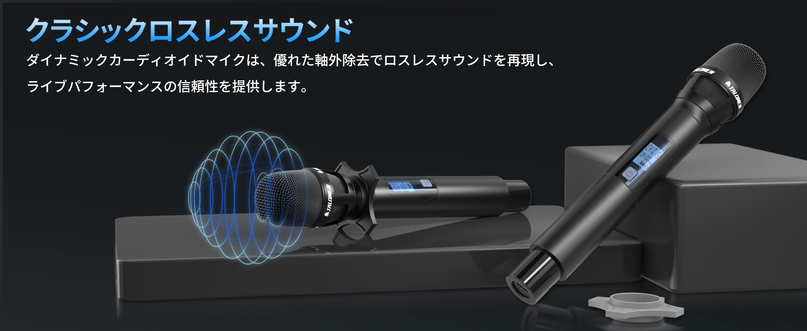 Talomen K120は、デュアルチャンネルUHFワイヤレスマイクシステムです。カスタムアンテナ付きの受信機と、プロ仕様にチューニングされたダイナミックマイク2本が付属しています。教会の礼拝、カラオケ、ホームパーティーなどに最適です。