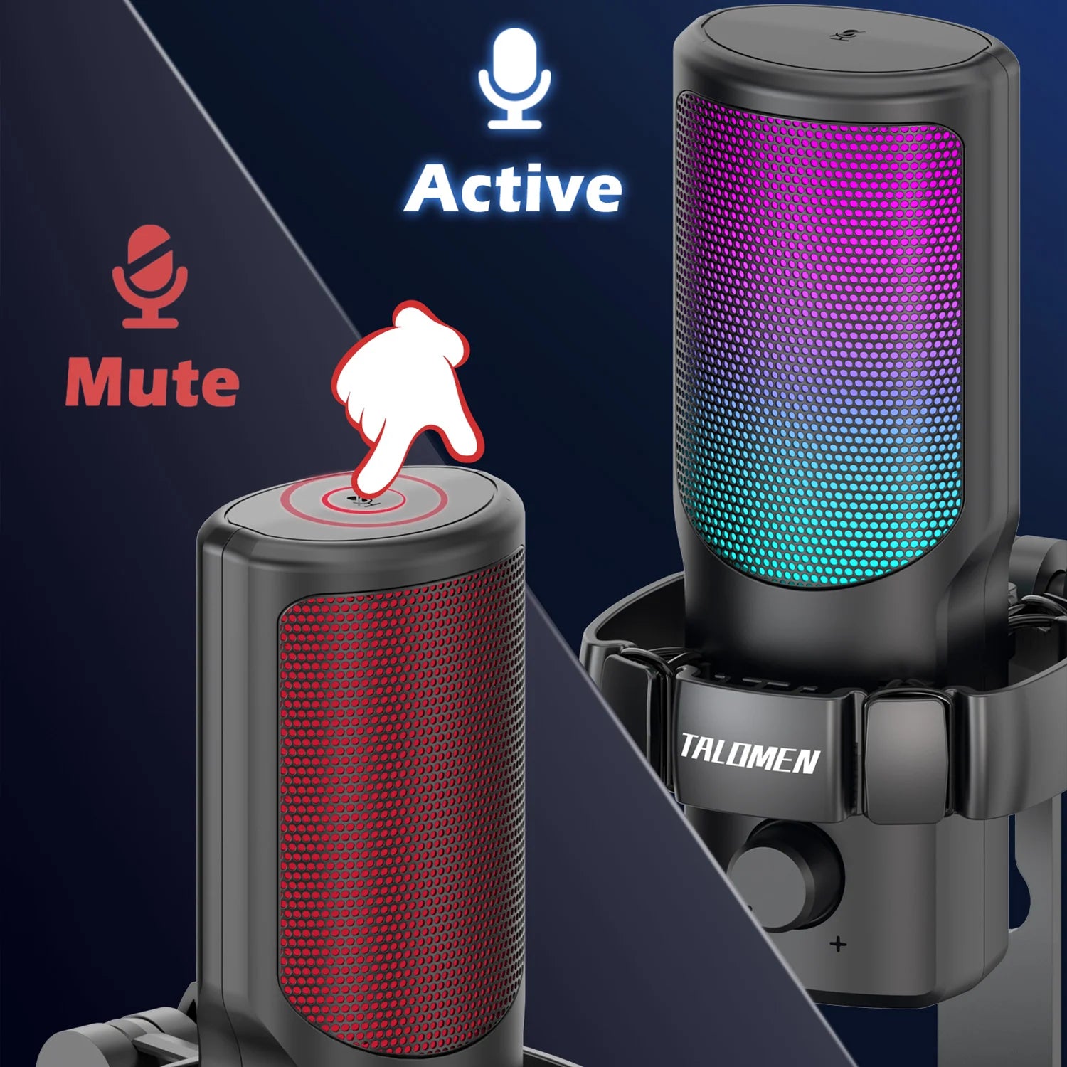Talomen USB gaming mic features vibrant RGB lighting with seven color modes, creating an immersive gaming atmosphere.